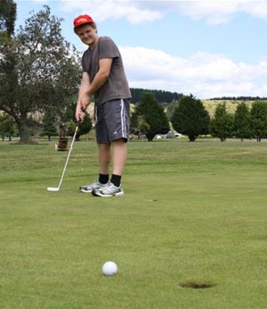 | Meanwhile, the year eights are either at golf with Mrs Gordon or at the skate part / pa site. Here's Hamish putting on the first hole. He got it in five. His team was the Hamburglars - Bryce, Alister and Hamish. |