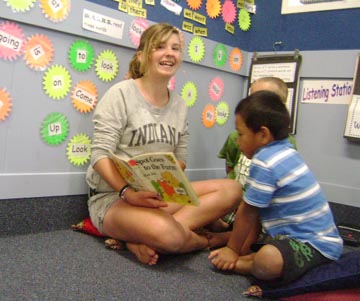 Mekaela is enthusiastic, as always, reading to her five year olds. Pihopa and Kade are enjoying Spot Goes to The Farm. Later Mekaela and friends taught their kids Stuck in the Mud and Seaweed. The little kids thought it was really cool. |