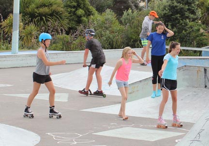 | Meanwhile, the rest of the year eights were at the skate park, then they went on to Tauwhare Pa site. Lots of people had scooters. Caden and Codi Laurent decide on their next moves, while Jessica Bell, Paige Carter and Inder Aujla look on. |