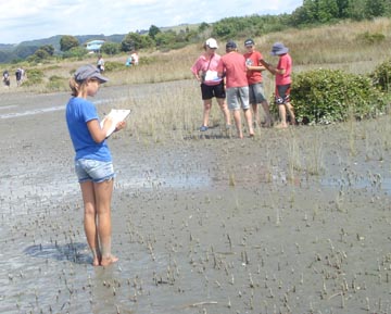 We then went to study the mangroves. They only grow as far south as this area, the Ohiwa Harbour. Toni is measuring the height of this mangrove. |