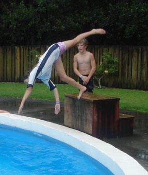 | Going off the high diving board was a challenge. Flash climbs up. |