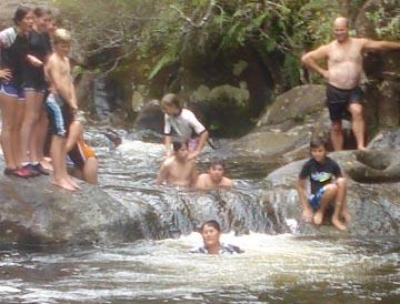 When we got back to camp we went down to the swimming hole. After quite a bit of rain, the river was flowing quite fast, so sliding down the waterfall was exciting and refreshing. Not this waterfall... |